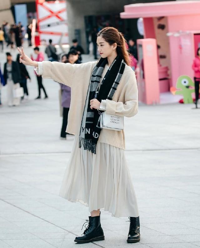 毛衣在我们的生活中是很常见的,尤其是进入了秋天以后,就更为常见很多了,这次的小姐姐就选择了一件灰色的宽松毛衣,不过在毛衣的里面则是选择了一件白色的打底衫,这样就可以起到更好的保暖效果了,袖子的位置稍微的挽起来,让造型可以具有更好的立体感,下面则是直接选择了一件灰色的纱裙,让造型更增加了几分的飘逸,脚上的鞋子则是选择黑色马丁靴,马丁鞋的颜色可以跟围巾的颜色呼应,让造型更完整的同时,也可以更多元化。