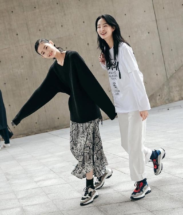 韩风里面很多见的就是比较宽松的版型了,这次的两位小姐姐就是走了宽松的路线,上面同样是选择了宽松的上衣,不过一件是黑色毛衣,下面搭配花色半身裙,让造型可以更保暖的同时,也可以起到更好的呼应效果,另一个则是选择了白色的卫衣,下面搭配白色裤子,裤脚的位置稍微挽起来,让造型的层次感更立体不少,脚上同样都选择了老爹鞋,不过根据衣服的不同,则是选择了不同的颜色,可以让造型更完整。