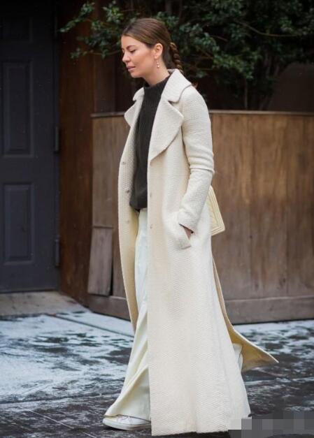 白色的大衣,气质满分。搭配一条深蓝色的显高阔腿裤,休闲又舒适。大衣里面内搭一件毛衣,保暖又时髦。和阔腿裤构成同色搭配,简约大方。脚踩一双小白鞋,和大衣的颜色相互呼应,十分有整体感。
