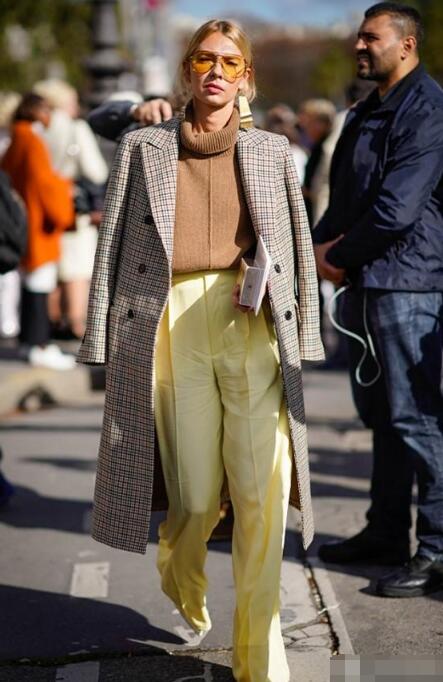 格子大衣,经典又复古。喜欢经典款的小仙女完全可以get这一款。下装搭配一条黄色的显高阔腿裤,使整体不再深沉,有点亮度。大衣里面内搭一件高领毛衣,兼具风度和温度,极具时尚感。