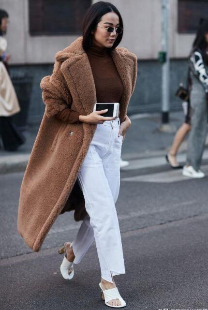 保暖的棕色长款大衣,保暖又时髦。pick一条白色阔腿裤,提高了整体的亮度。大衣里面内搭一件深棕色的单品,十分显瘦,轻松彰显你的自信。把白色单品的下摆塞进裤子里,展现了高挑的身材。脚踩一双白色的鞋子,显得十分高挑有气质。