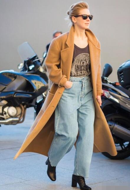 保暖的棕色大衣,颜色上给人十分舒服的感觉。pick一条宽松的牛仔阔腿裤,简约又舒适。大衣里面随意内搭一件T恤,极其简单。脚踩一双黑色的短靴,显的得十分高挑。