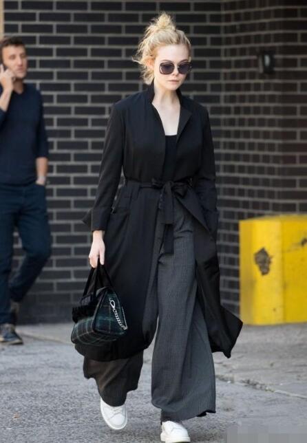 黑色的薄款大衣,搭配一条宽松的显高阔腿裤,颜色上十分低调,显得特别有气质。在大衣的腰间系一条腰带,凸显了纤细的腰肢,展现挺拔的身材。脚上pick一双小白鞋,和大衣黑白搭配,十分简约低调,轻松彰显你的自信。同时也使整套穿搭有了亮度,手提一格纹包包,又复古又新潮,十分好看。