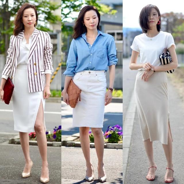 这组搭配第一眼看过去就会让人感觉十分气质,这全都归功于铅笔半身裙。铅笔半身裙可是超多成熟女性都爱的搭配单品,它会比a字半身裙更凸显身材曲线,又不会像包臀裙那样太过于妩媚。选择一款铅笔开叉半身裙搭配衬衫,外搭一件条纹西装外套,气质又知性,彰显魅力。蓝色衬衫搭配白色铅笔牛仔裙也很好看,不仅显得清新舒适,同时还能穿出女人味。直接单穿白T搭配铅笔开叉裙超nice,优雅大气。