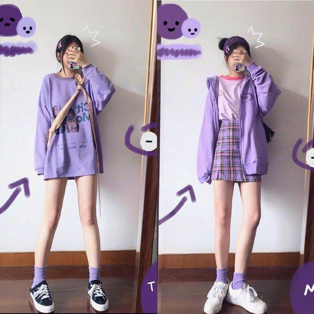 整身的紫色穿搭更人以强烈的视觉感,紫色的运动外套内搭是一件浅紫色的T恤,T恤上面有一个可爱的卡通图案,也把女人显得格外的可爱, 同时还充满了运动气息和活力气息。
