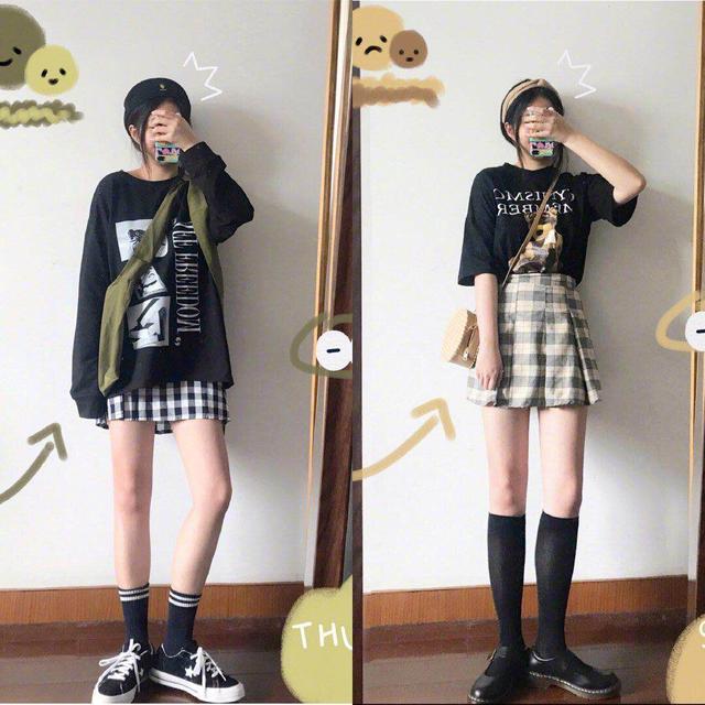 裙子是一件格纹的A字短裙,由灰色和黄色组合而成的格纹短裙和黑色T恤格外合拍。穿起来有浓浓的少女感气息,很多女人对这套穿搭散发出来的魅力都招架不住~