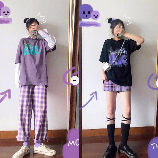 裤装穿一件紫色的格纹阔腿裤,裤脚微微挽起。休闲宽松同时风格也十分强烈,想要酷炫又优雅的穿搭就一定要选择这一套哦。