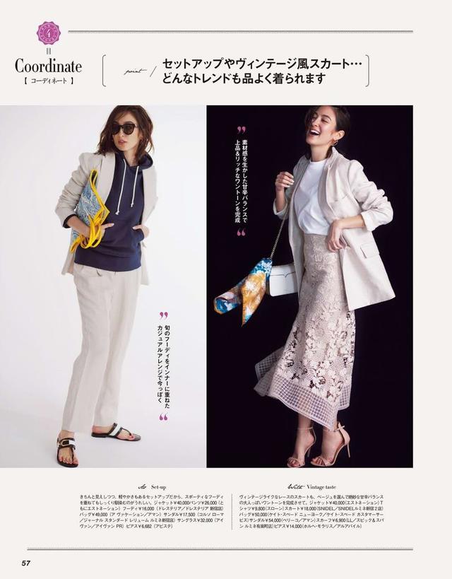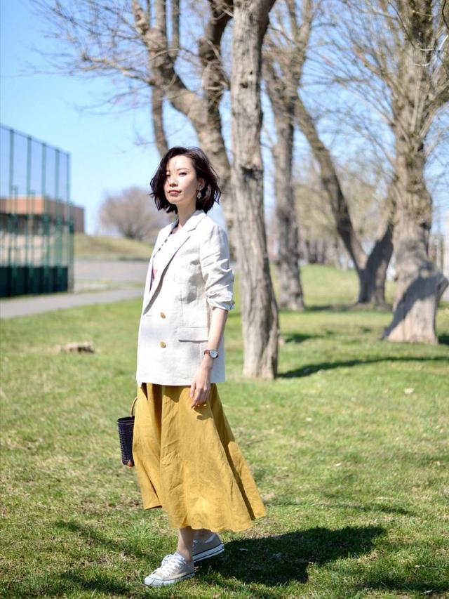 半身裙能削弱西装带来的沉闷感,只要把色系搭配好了能穿出多种不一样的风格,例如白色西装与黄色半身裙色系搭配恰到好处,不会太艳也不素,还能把气质衬托的优雅。黄色耀眼却不那么抢眼,能让春天显得温暖,休闲西装既有正式感又不沉闷,配上优雅的半身裙,让女性显得文文静静。