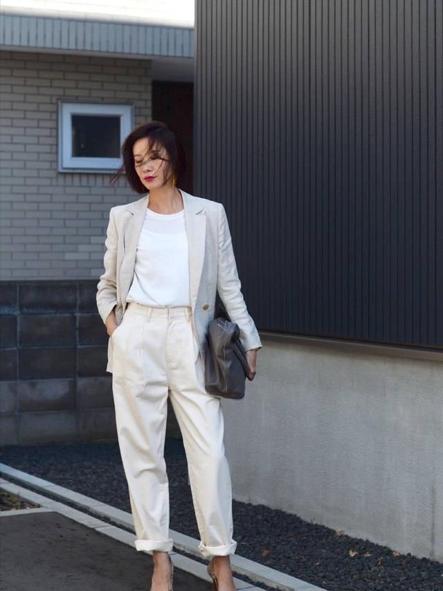 浅色与浅色搭配在一起显得更高级,白色T恤圆领的设计露出颈部曲线的同时,也勾勒出精致的五官,卷起来的直筒裤为整个造型增添了几分休闲的气质,露出的脚踝让女性显得更高挑更瘦。搭配的浅色西装虽然是同色浅,却没有完全相同,这样的色系搭配削弱了色彩的单调感。