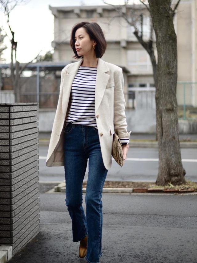 今年非常流行条纹元素,一件经典的黑白条纹T恤配上浅色西装,有一种随性的懒散感,又不职业女性的正式感。下半身牛仔喇叭裤既有修饰腿型的作用,也对身材有更多的包容性,牛仔的元素又为整个造型带来时髦的气息。这一整套搭配下来丝毫没有西装的沉闷感,反而显得很舒适自由,优雅不挑人好驾驭。