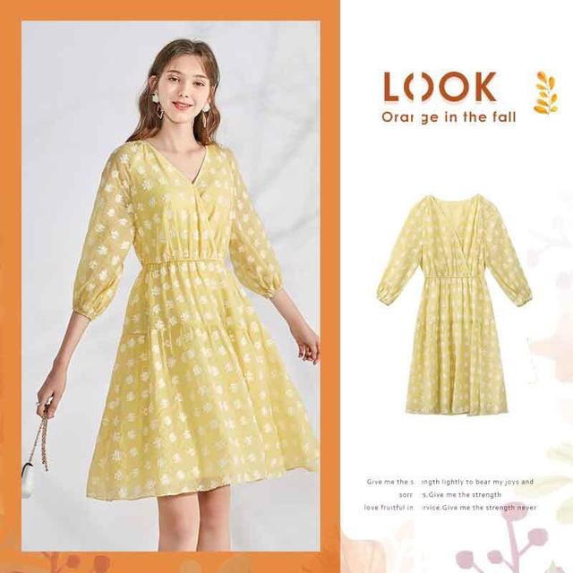 这件黄色的连衣裙上开满了白色的小花,给人一种非常甜美的感觉。礼服是七袖的设计,再加上花朵的设计,似乎有一种特殊的春意盎然。