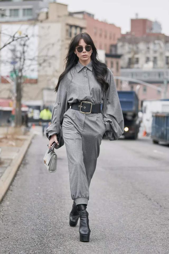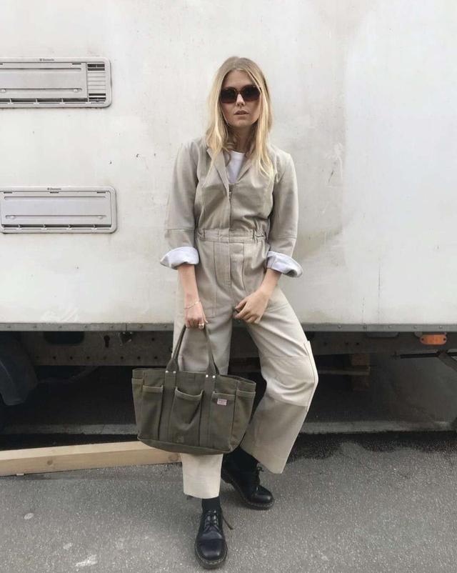 工装风一般都是偏向于宽松利落的,再加上连体的设计,难免就会有些压个子。所以,制造出高腰线很重要,用腰带就是一个很好的解决方法。腰带不仅可以用作装饰,还可以打造出高腰线和大长腿,让整体的身材比例变得完美。又或者是选择一个腰包来实现强化腰线的效果,清晰地划分了腰线,又增加了整体穿搭的细节感,看起来更加时髦。