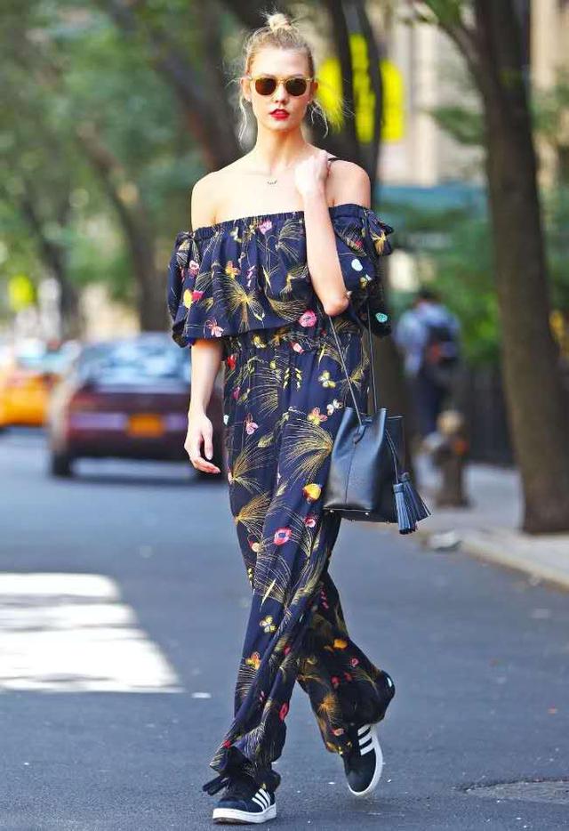 如果你是的肩线很漂亮,但腿型不好看是属于上瘦下胖的女生的话,吊带连体裤绝对是你的最佳选择了。宽松的版型与飘逸的材质,露出你的香肩和锁骨,简直就是一级棒的街拍效果。如果是性格比较狂野的女生还可以大胆地尝试一下吊带设计配上性感深V的连体裤,一双一字高跟鞋,让你看上去时髦又充满野性。