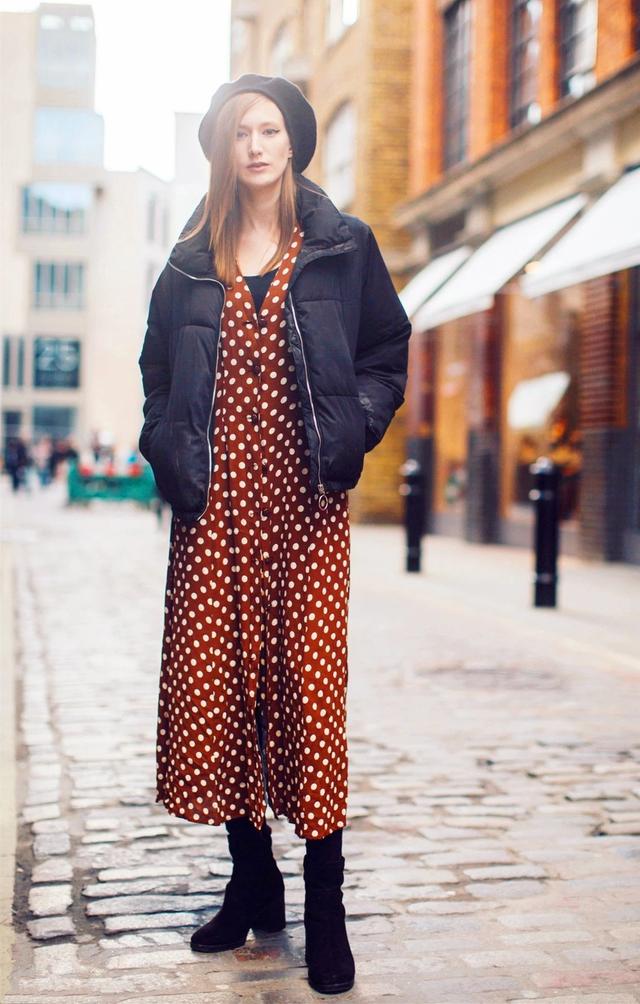连衣裙的好处在于不用再多花心思在搭配上,只需一件连衣裙,就可以搞定上下的搭配,整体色彩呼应,色调统一;再选择一件棉服,整体搭配就完成了,容错率高,对于穿搭小白来说十分友好。连衣裙气质温婉,材质柔和,可以弱化棉服沉重厚实之感,让棉服看起来少一些臃肿感,而且也不会有显胖的风险。