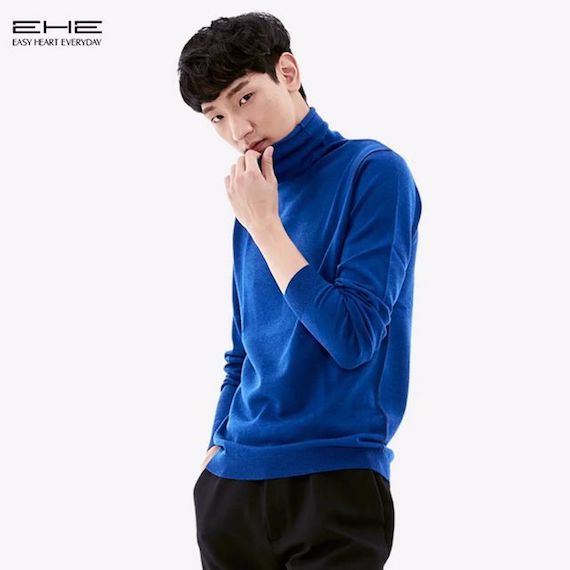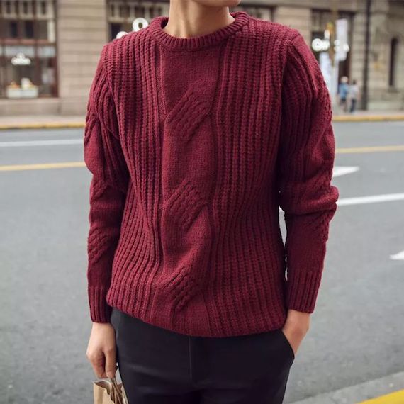 ▲酒红色修身套头圆领毛衣,针形是一大亮点,采用粗针凸显衣服的大气和男士的粗狂,在冬日里搭配起来却更有暖男的气质,凸显出男士的绅士风度。男装搭配。