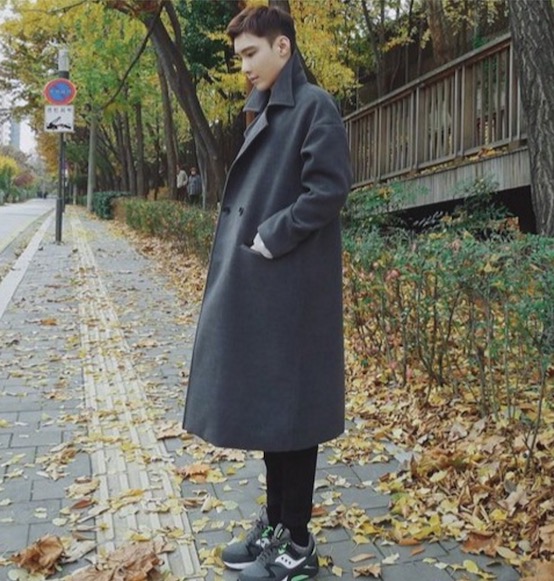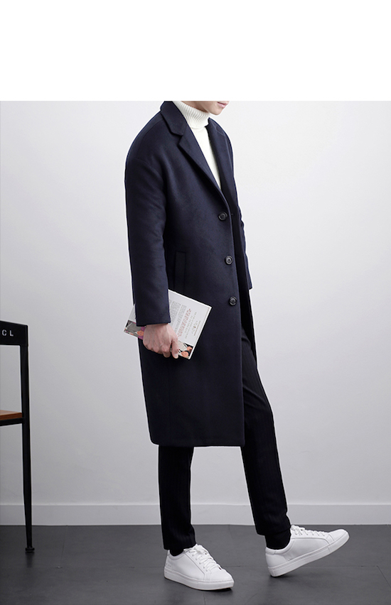 4.这款大衣长度达到小腿肚,比较休闲,适合寒冬,有日剧男主角的即视感,随意搭配小脚裤,就能将身材比例拉的刚刚好。掌握男生穿衣搭配技巧,矮个子男生也是大长腿