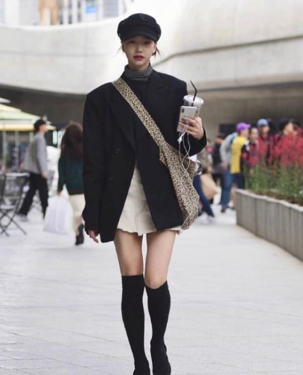 首尔时装周的两宝:豹纹包和西装。感觉拥有这两样就能搭配出高级感。黑色阔版西装衬气场方面很是优越,垫肩的设计让肩宽撑的起衣服。内搭白色不规则短裙既性感又能提亮,同时秀出大长腿真的是太聪明了。
