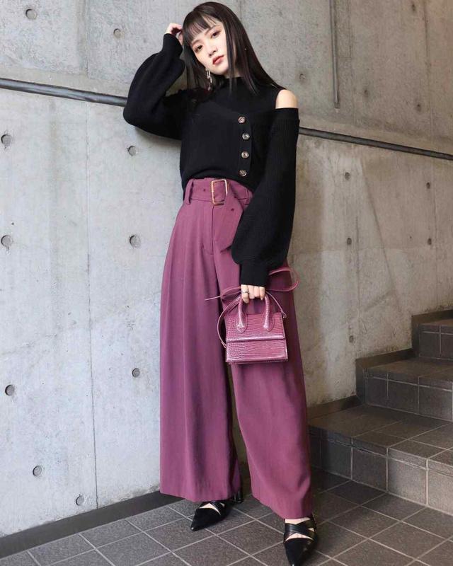 不知道大家都还记不记得,露肩毛衣是几年前的流行款式,露肩毛衣与紫色阔腿裤紧密的联系在了一起。阔腿裤的腰间采用腰带系扣法,女性的小蛮腰落隐落现,毛衣当然要选择一款宽松款式,这也是为了与阔腿裤相映衬。尖头皮鞋和手提包也是最新流行的款式,很有时尚感。