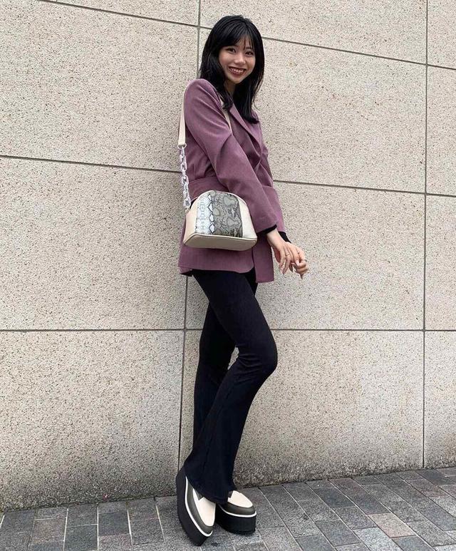 翻领西装外套更严谨,粉紫色西装却尽显女人的魅力与优雅。宽腰带收腰的设计使腰部纤细有型,而且身材的凹凸之处都格外的明显。内搭一件黑色打底毛衣,仍然魅力不减,裤装搭配黑色长款修身裤,笔直又修长的双腿让整个人看起来分外的有气场。