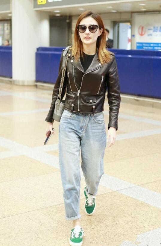 敞开穿的皮衣拉风十足,拉上拉链的皮衣也一点都不逊色!徐璐的这身紧身夹克皮衣搭配褪色牛仔裤,是不是觉得又酷又帅气!相比于敞开拉链的皮衣,拉上拉链的皮衣能更好地显露上半身的曲线,搭配屋。成熟女人的曼妙身姿一览全无,即使没有显露任何地方,也能让人遐想皮衣下面包裹的苗条身材!下半身裤脚随意扎起来的牛仔裤和搭配的一双绿色小板鞋,给整体的穿搭融入了慵懒随意的气息!很好的过滤掉黑色紧身皮衣带来的严肃感。