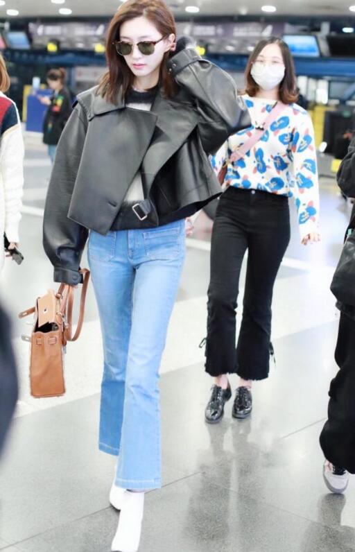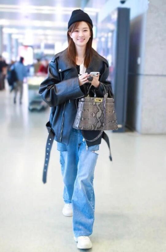 皮衣作为夹克,也有许许多多的款式,像乔欣的这身中长款宽松型的皮衣夹克就算比较常见的一种了!松散型的穿着会给人比较亲和随意的第一视觉感,乔欣身材就非常的不错,足足有170的个头,宽松的夹克外套搭配阔腿破洞牛仔裤,这身有颜随心的穿搭真的是给人青春靓丽十足的感觉呀!