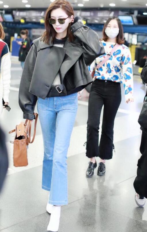 江疏影的这身夹克皮衣搭配喇叭裤牛仔就透露着浓浓的欧美范!皮衣款式的夹克不仅时髦也很显腿长,哑光光滑面料的皮衣低调又显气质,敞开型的夹克虽然拉风时髦,但是却不保暖,内搭就可以穿毛衣或者厚点的保暖衣,这样就十分保暖还不失潮流范!下半身我们可以选择浅色系的牛仔裤进行搭配,能很好的柔化上半身黑色夹克带来的压抑感!后裤袋型的口袋设计作为裤子的点缀,给牛仔裤的版型添加了一抹独特的亮点!喜欢欧美风的女性不妨试试江疏影的这身穿搭,简单复古又时髦!