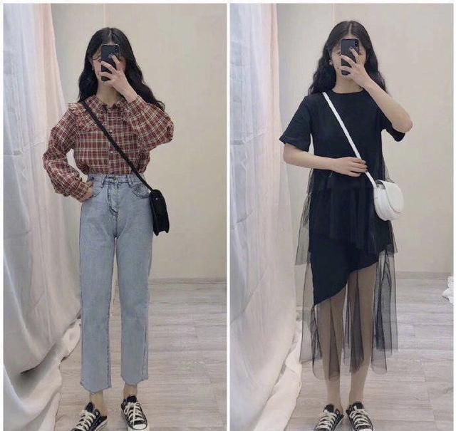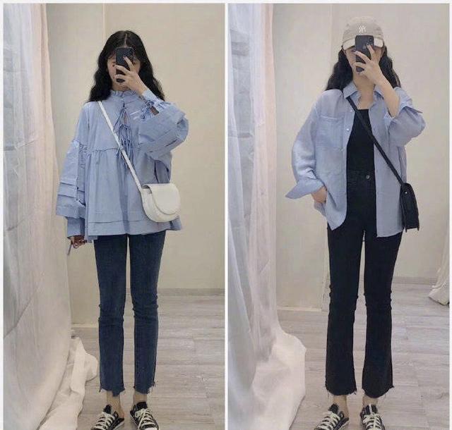 蓝色系列的搭配,但是在设计上却是两种不同的风格,蓝色衬衣既有蝴蝶结设计而且袖子宽松且有叠加的设计,很有田园少女的feel~。裤子适合搭配深蓝色的修身牛仔裤,九分的长度刚好将脚踝裸露出来,显腿长的同时也是比较时尚的。鞋子依靠一双经典帆布鞋来支撑,经典脱俗,简单安静,像一个安静的脱俗的小女人。