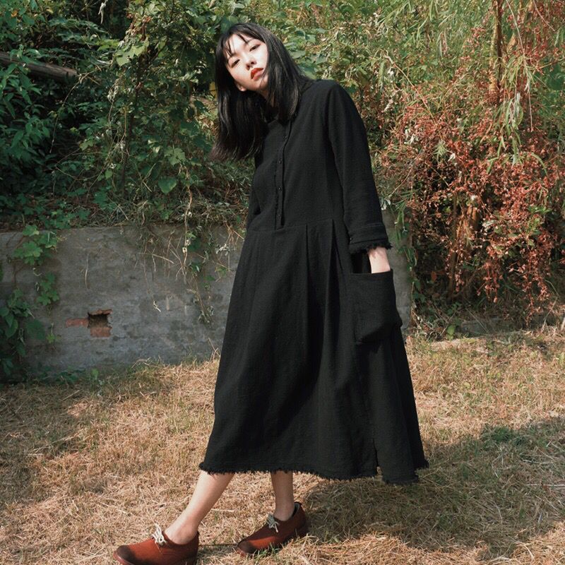 纯色连衣裙,在简约中暗藏质感。胸前、领口和裙摆的流苏与不对称的小翻领设计别有用心丝,毫不忸怩做作~棉麻的面料舒服又透气哦。