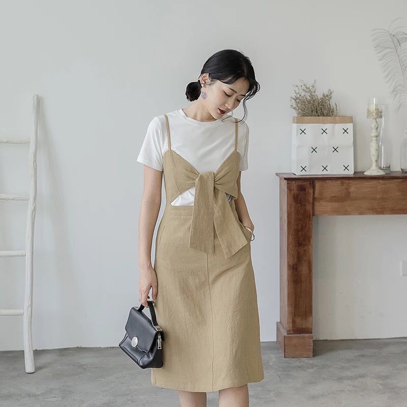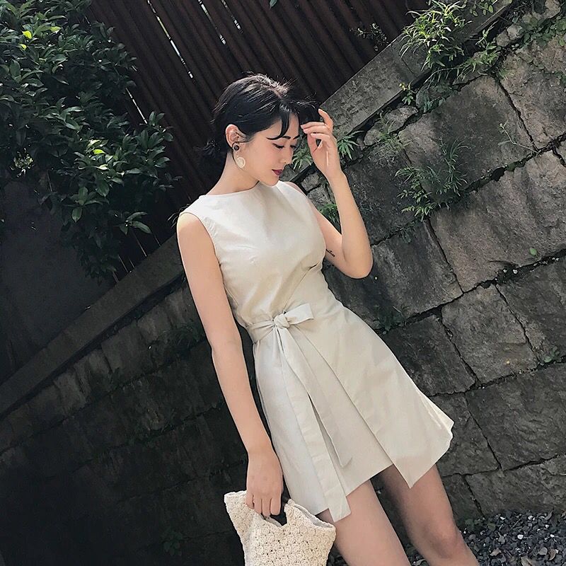 别具廓形的棉麻料改变了吊带本身的柔情标签,多了一丝的爽朗。相对于单穿,内搭简约纯色T恤反而会更具个性。简单系上胸前的带子,给人眼前一亮的别致。裙摆后的开叉设计,与系带前后呼应。