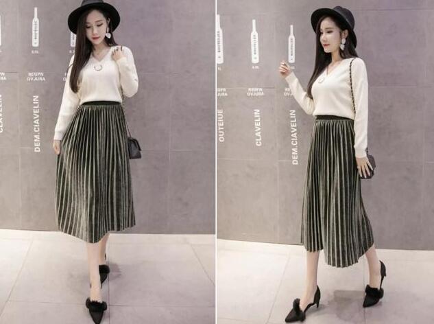 很好看的一款百褶半身裙,上身效果十分的美腻,绿色的调调,清新又时髦,a型半身裙流行款式,怎么搭配搭配高腰+a型裙型,无论谁穿起来都很好看的,关键的是可以巧遮你腿部多余的赘肉,非常显腿瘦的哦,上衣搭配白色毛衣,谁穿谁好看,还很显气质。