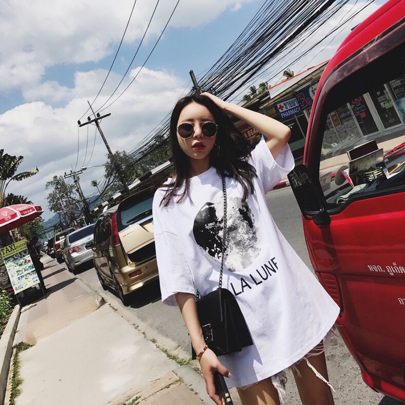 这款是地球印花T恤,是不是很有意境呢?黑白灰的搭配尽显格调,宽大的版型包容你的不自信,吃再多也不怕啦,男生也可以穿哦!棉面料廓形性很好。
