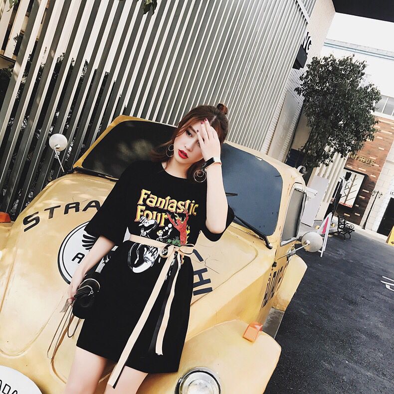 厉害了,这款T恤裙还加入了腰带设计,要不怎么说今年的飘带很流行呢!系上立马就穿出了时髦感,还能打造出高腰线,显高又显瘦,T恤裙的印花也很出彩。