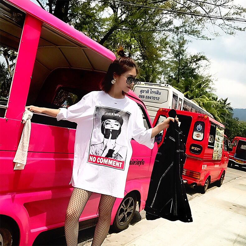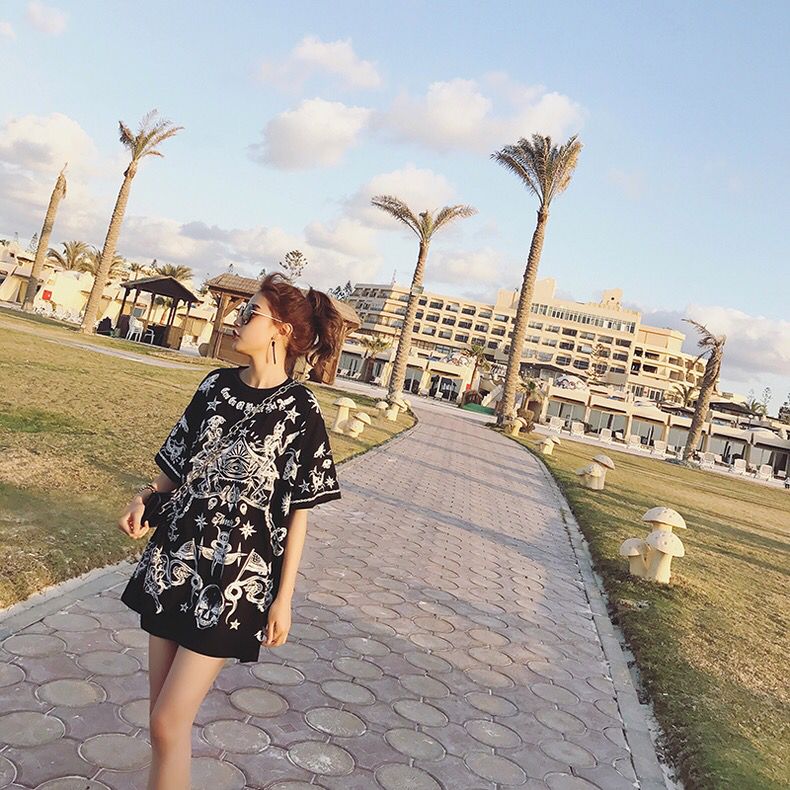 大胆的人物头像印花,有没有刺激到你呢?带着美式街头的复古气息,这款T恤裙也是别有一番韵味。肥大的版型会让你很有安全感,肉肉全都隐藏起来了。