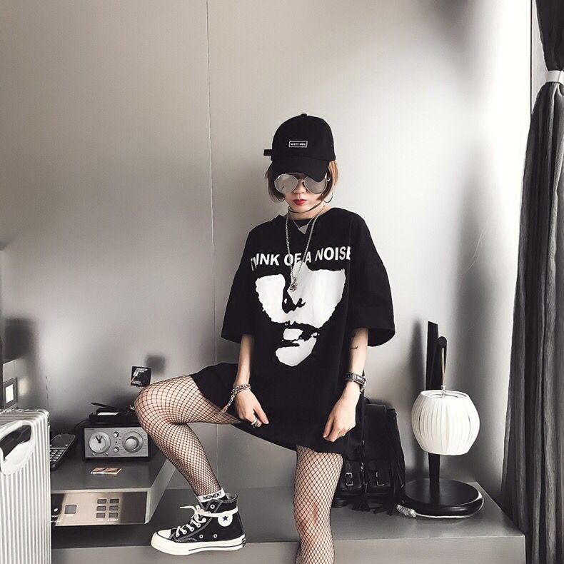 这款T恤的人像印花就很抽象了,相比上一款更有意境一点,简约的黑白色透出一股暗黑气质,穿上也给人酷酷的感觉,模特搭配渔网袜也是当下很时兴的穿法哦!