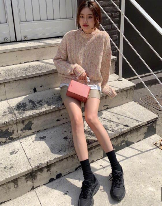 虽然已经进入了秋天,不过在中午太阳比较好到时候,温度还是相对比较高一些的,这个时候我们就可以继续来穿裙子啦,这次的小姐姐同样是选择了一件毛衣搭配,不过整体粉色的毛衣上设计了不同颜色的印花,让整个造型可以看上去更时尚很多,为了营造更好的层次感,他在毛衣的里面搭配了一款白色的T恤,T恤的下摆再毛衣的下面露出来,起到更好的层次效果,下面则是选择了一件卡其色短裙,短裙的设计让她的腿更显长很多。