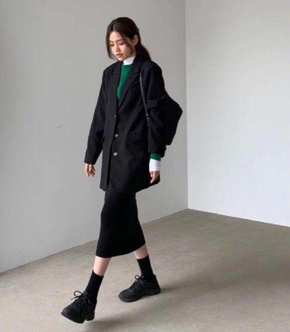 在众多小仙女的搭配方式,理念当然是少不了黑色的衣服了,找其他小姐姐就选择了一身的黑色搭配,上面是一件宽松版型的西装,外套,下面搭配同样黑色的半身裙,上下黑色呼应,让造型可以更完整很多,简约风女生搭配衣服技巧不过在西装外套的里面则是选择了白色的打底衫以及绿色的毛衣,除了可以让造型更保暖以外,也可以让整体的层次感更鲜明。