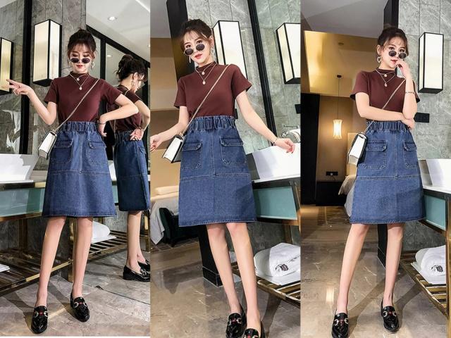这款简约的A字牛仔半身裙,松紧腰的设计,穿脱都很方便,一字前面的翻盖口袋装饰,美观实用,刚过膝盖的长度,能够完美遮盖住小肚腩和小粗腿,想不显瘦都难啊!