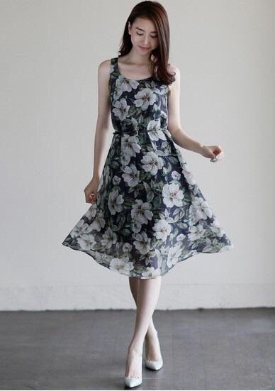 底色浓厚似暮霭沉沉,夏花依然不改其绚烂,深色背景突出花色之洁白、蕊之细腻,每一朵都渗透着木槿温柔、坚韧、永恒之美。素雅色调恬淡宜人,干净利落的无袖和圆领尽显清凉优雅,高贵真丝衬托知性美和上佳气质。