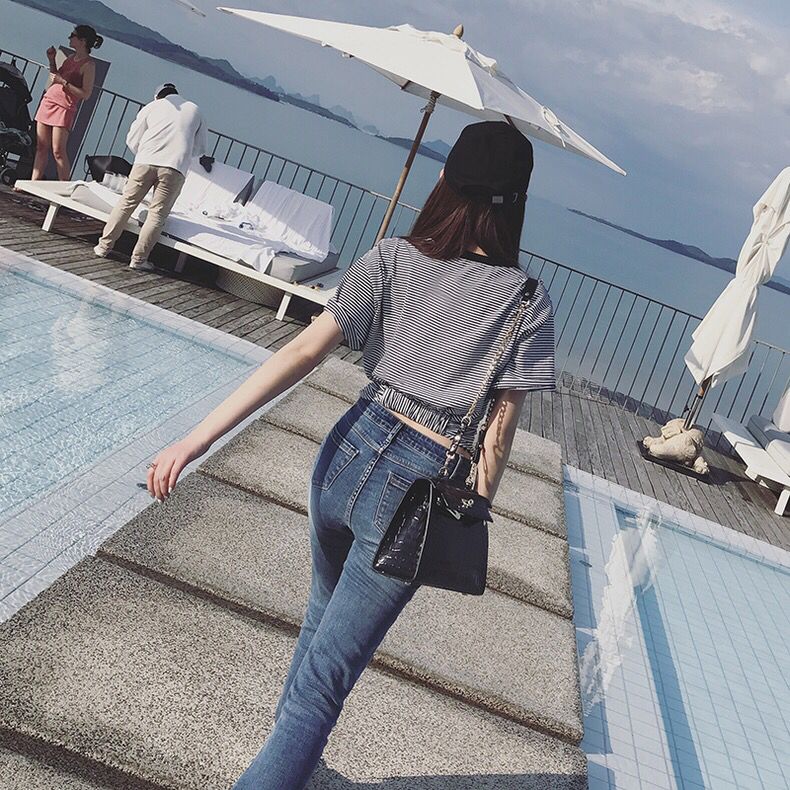 腰间有交叉拧花设计的条纹T恤搭配,穿上显得腰肢纤细苗条,下装不管怎么穿,都可以让你的身材好到爆,复古的摩登气质很轻松就可以get到,想让自己看起来多点性感的MM不可错过哦。