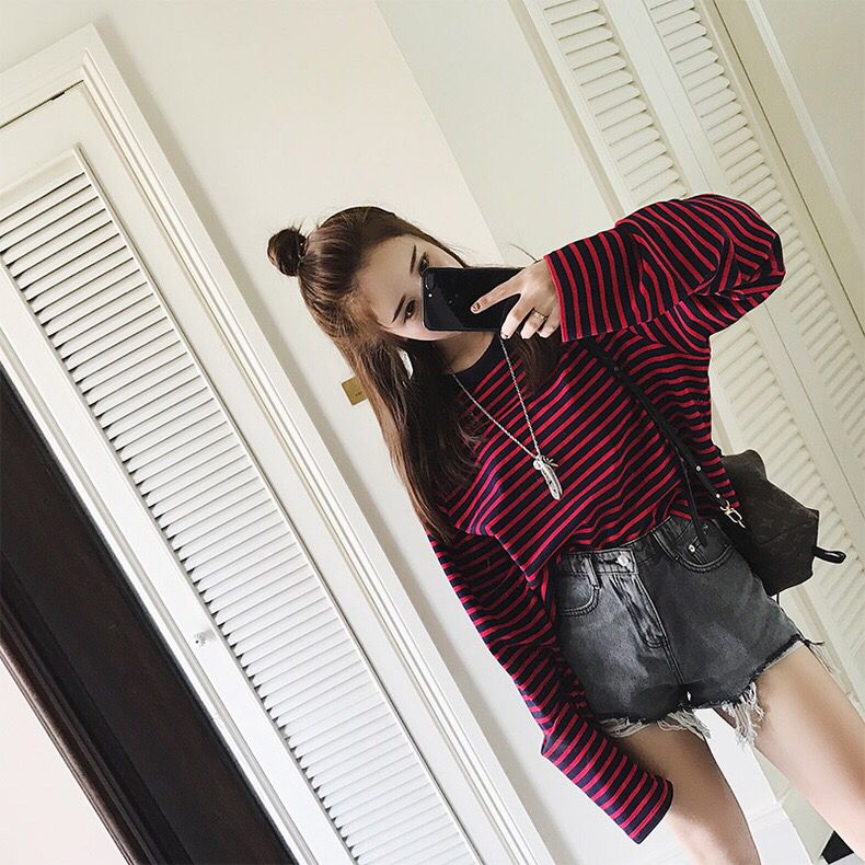 长款的宽条纹T恤搭配,宽松的版型舒适不挑身材,四款颜色清新甜美,加上部分破洞设计,紧随时尚潮流的同时,打破沉闷感,时尚又好搭配,下装简单穿上半裙、牛仔裤就可以清新有活力。