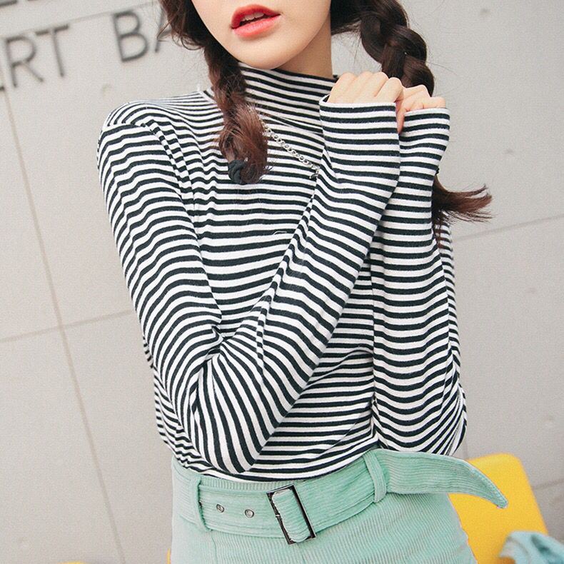 高领的黑白条纹衫搭配,保暖又好搭配,细细的横条纹,内搭时显得细节感十足提升时尚度,触感顺滑的棉质面料,不易起球好打理,带弹性的可以很好的贴合身形,是遮肉的一把好手,显瘦的经典款。