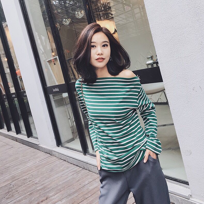 一字领的横条纹T恤,见多了常规的条纹衫搭配,遇见这样设计别致的含蓄性感上衣,总不免让人眼前一亮,内搭单穿都时尚又有味道,绿白、男装搭配,黑白条纹两种可选,出彩的搭配也许就需要多这么一点点有心的设计就够。