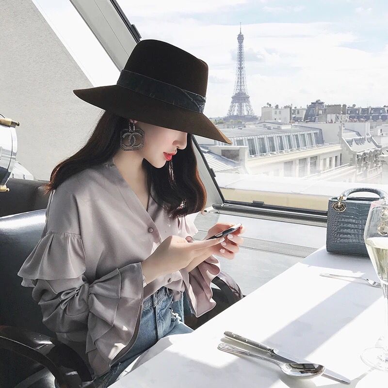 偏厚实的面料,光滑柔软,整体上身舒适,前中的开襟设计加包扣,精致感立现,还有荷叶边的袖口设计,微露小臂,说不出的诱惑,新颖时尚,减龄效果也很棒!