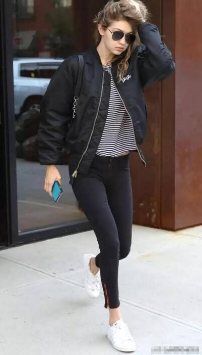 黑色九分裤搭上小白鞋,露出脚踝最纤细的部分,格外优雅秀气。上装选用黑色的短款外套,简约又帅气。内搭条纹单品,经典又时尚。九分裤怎样搭配时髦又显高?pick这7款鞋子第一款,清新又减龄。