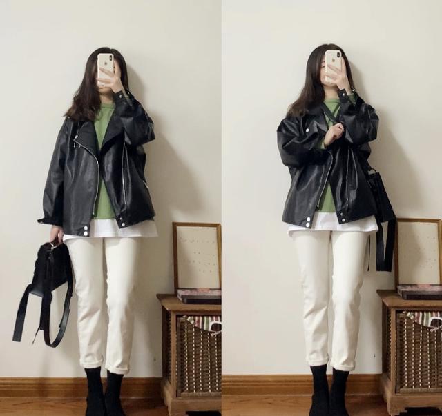 皮衣除了可以用来搭配裙子,和裤子更是绝配呀!白色的烟管裤特别显腿细,同时挺括的裤腿还能把双腿修饰的更加笔直。如果你的双腿不是那么笔直,用这样挺阔的烟管裤就最能展现完美双腿的造型啦。烟管裤搭配黑色皮衣,黑色与白色打造出更加高级的视觉体验,简约而精致的时髦风,最适合上班族女生啦。
