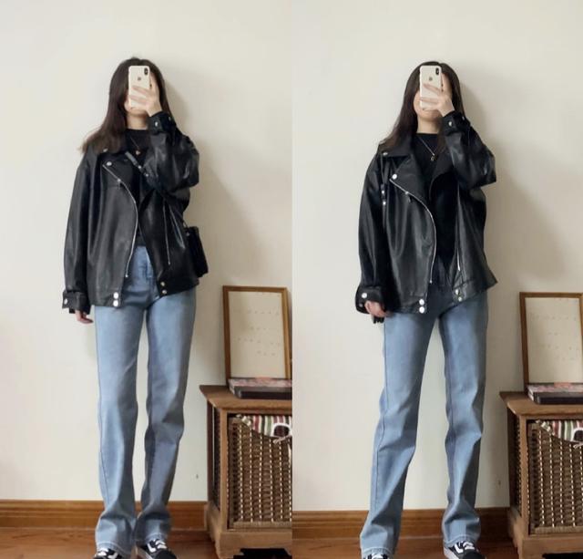 如果想要显腿直的话,烟管裤是最好的选择。但如果想要显腿长的话,那么高腰裤就是最不可错过的啦。尤其是直筒的高腰裤,拉伸腿长的同时,更有一种与生俱来的潇洒范。搭配黑色皮衣,炫酷时尚。可爱的甜酷少女风,也不过如此啦。