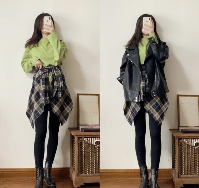 喜欢运动风女孩子,总是不太喜欢连衣裙的穿搭。毕竟太过女人味的连衣裙不太太适合运动。所以不妨用衬衣系在腰间,打造出裙子的错觉。不仅时尚有范,还更加帅酷精致呢。灰黑色系的格子衬衣,搭配一件牛油果绿的卫衣,甜美又减龄,利用一件皮衣外套,充分打造出更加耍酷甜美的造型。没有裙子,同样适合可爱的小仙女呀!