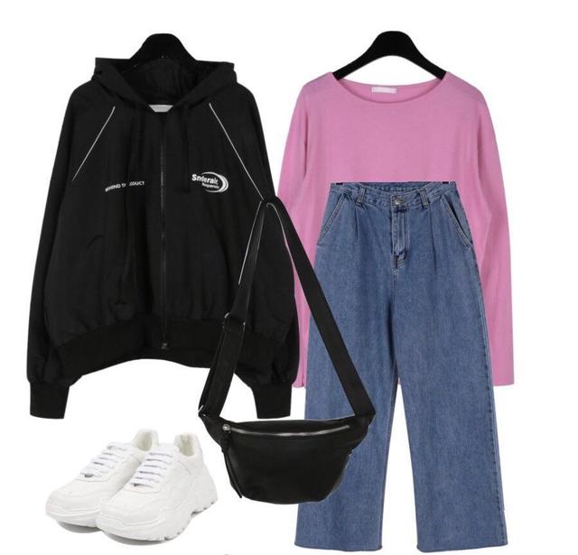 粉色的上衣,衣身和袖口剪裁都比较宽松,穿着感受十分舒适。裤装也选用的是比较宽松的剪裁款式,整体上给人一种休闲的风格。黑色的外套也是偏向宽松的黑色休闲外套,给人一种酷酷的感觉,和粉色外套搭配之后,气质成熟又温柔,是不是看起来就很印象深刻呢?