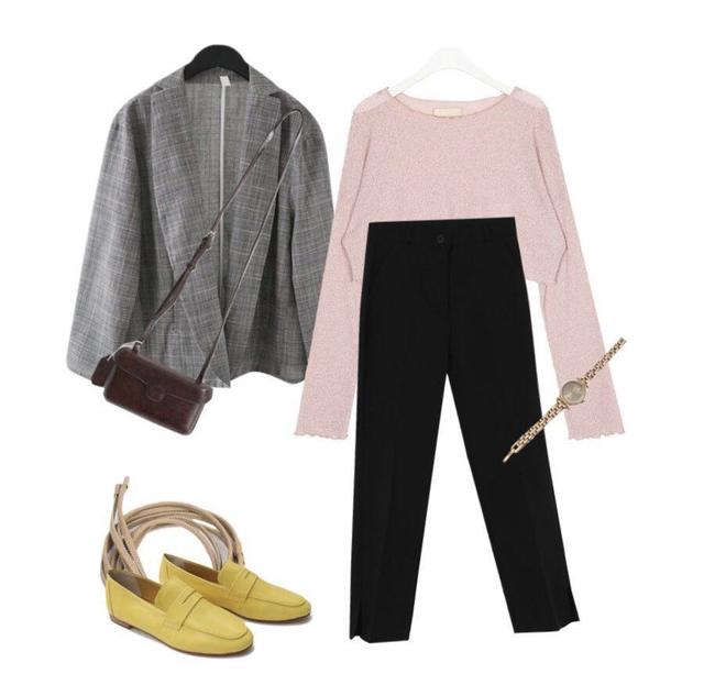 颜色很淡的粉色上衣,用的是薄款的面料,能够让女人看起来更加清新又优雅。而黑色直筒的长裤能够让你看起来更瘦,也更加有上班族的干练简约气质。