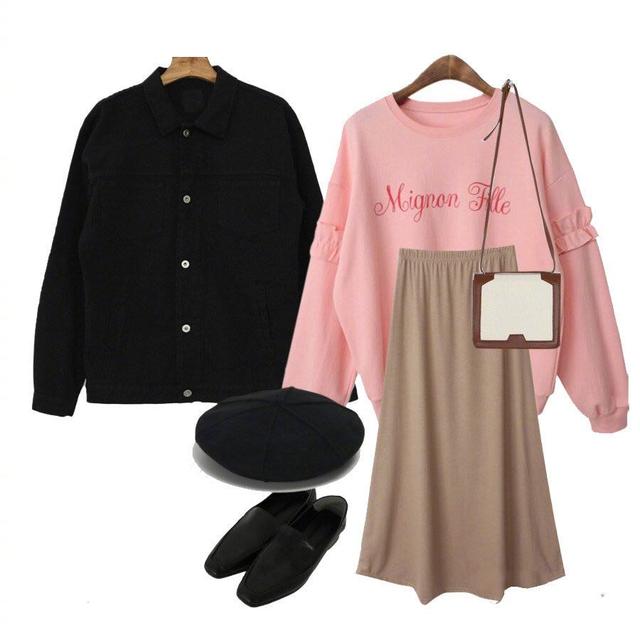 粉色卫衣宽松的设计让人感觉十分休闲,同时袖口用了蕾丝点缀,显得更加有女人味。而裙装的色彩是浅驼色,则给人一种温柔文静的感觉,在气质上能够让女人更加稳重和典雅。
